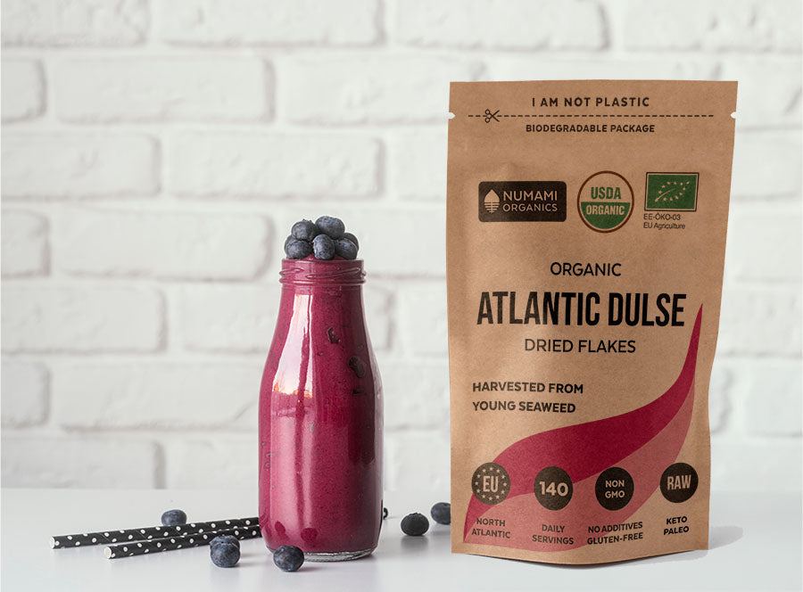 One gram of our Dulse flakes equals 20 grams of fresh seaweed. The easiest way to incorporate Dulse Flakes in your diet is to use it in a morning smoothie.